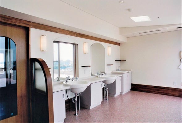 トイレ、洗面所利用のプライバシーが保たれ利用しやすくなったとのことです。以前は見られているようで気になっていたとの入居者の意見でした。設計段階で施設側スタッフの意見を取り入れた案が実現しています。